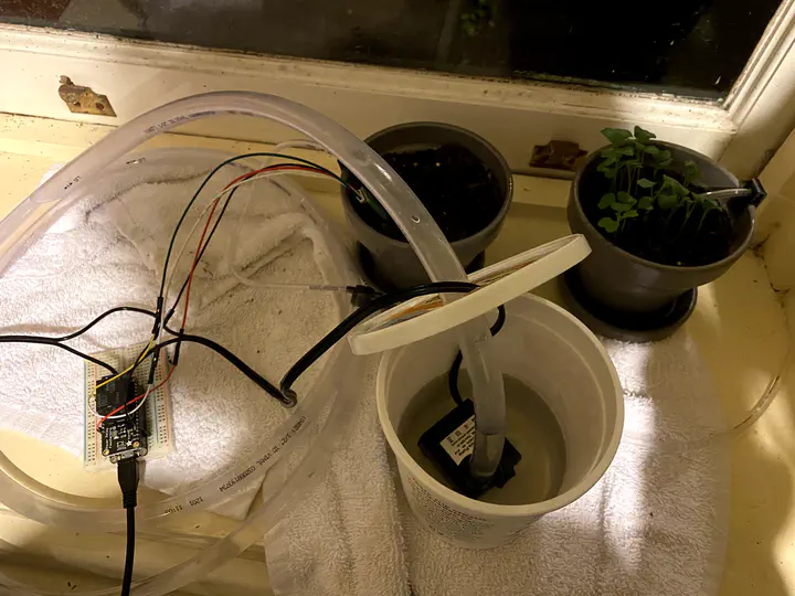 I created an automated watering system to care for my plants. The system uses a WiFi equipped Adafruit Feather board with a relay wing. This is connected to a temperature and moisture sensor that is inserted into the soil. The relay operates a small submersible pump. 3D printed fittings connect tubing to the pump output. Historical and live data from the sensor can monitored from my website.
